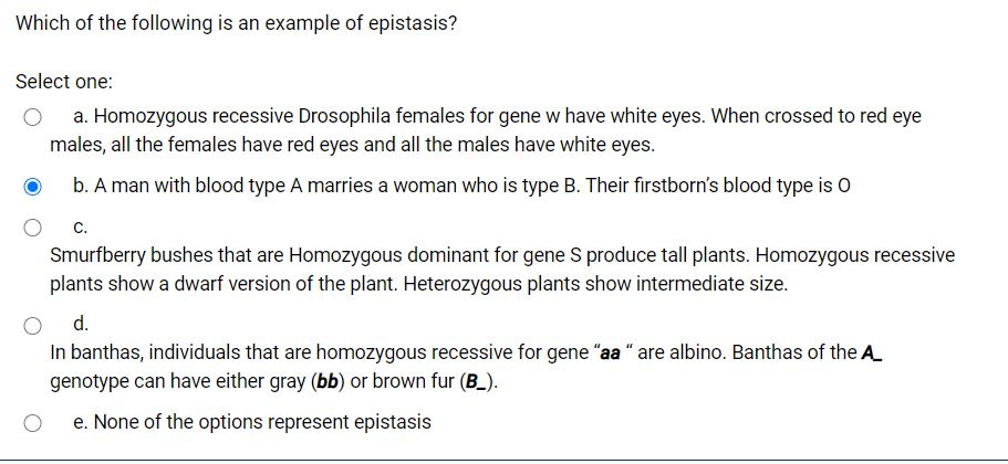 Which of the following provides an example of epistasis. C In rabbits and many other mammals one genotype cc prevents any fur color from developing. B The allele b17 produces a dominant phenotype although b1 through b16 do not.