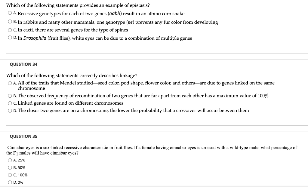 C In Drosophila fruit flies white eyes can be due to an X-linked gene or to a combination of other genes. In cacti there are several genes for the type of spines. 33 Which of the following provides an example of epistasis.